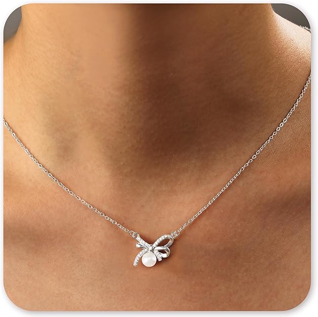 Bow Necklace Gold Necklace for Women, 14k Dainty Gold Choker Necklace Stack as Cute Jewelry for Teen Girls, Waterproof Pendant Necklace Bow Jewelry as Ribbon Necklaces with Bowknot Ball